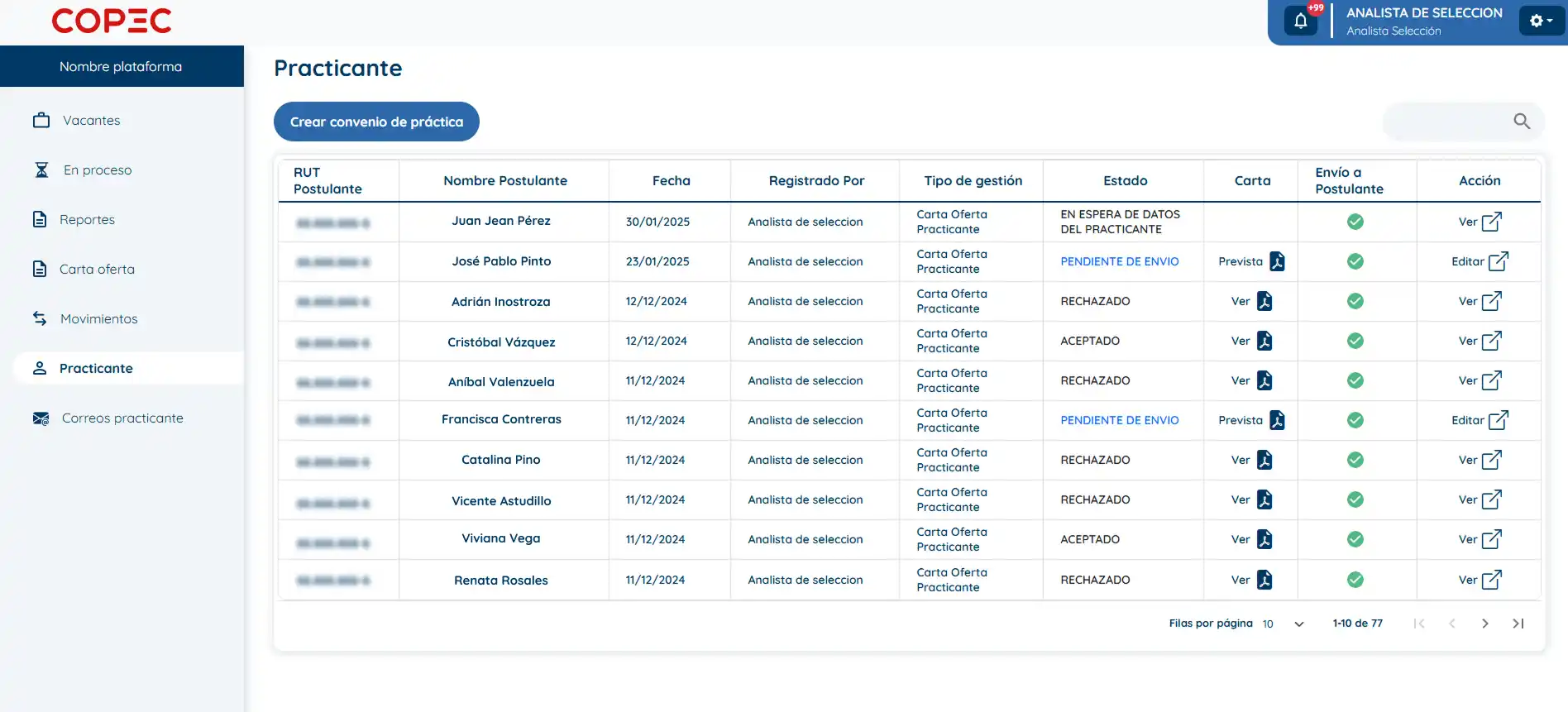 Desarrollamos un sistema digital que estandariza además de acelerar el proceso de reclutamiento y contratación en Copec. La plataforma permite la integración con servicios externos como SAP y Webdox, facilitando la gestión documental, la firma digital y la conexión con los sistemas internos de la empresa. Esto mejora la eficiencia operativa y reduce tiempos en la contratación de talento, asegurando un flujo de trabajo más ágil y automatizado.